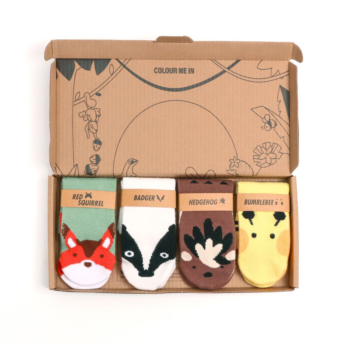 Unsere superweichen Babysocken sind bedrohten Tierarten gewidmet. Die bezaubernden Vierer-Sets kommen in einer Geschenkbox, die auch als Ausmalbild und Kulisse für das Puppentheater verwendet werden kann.