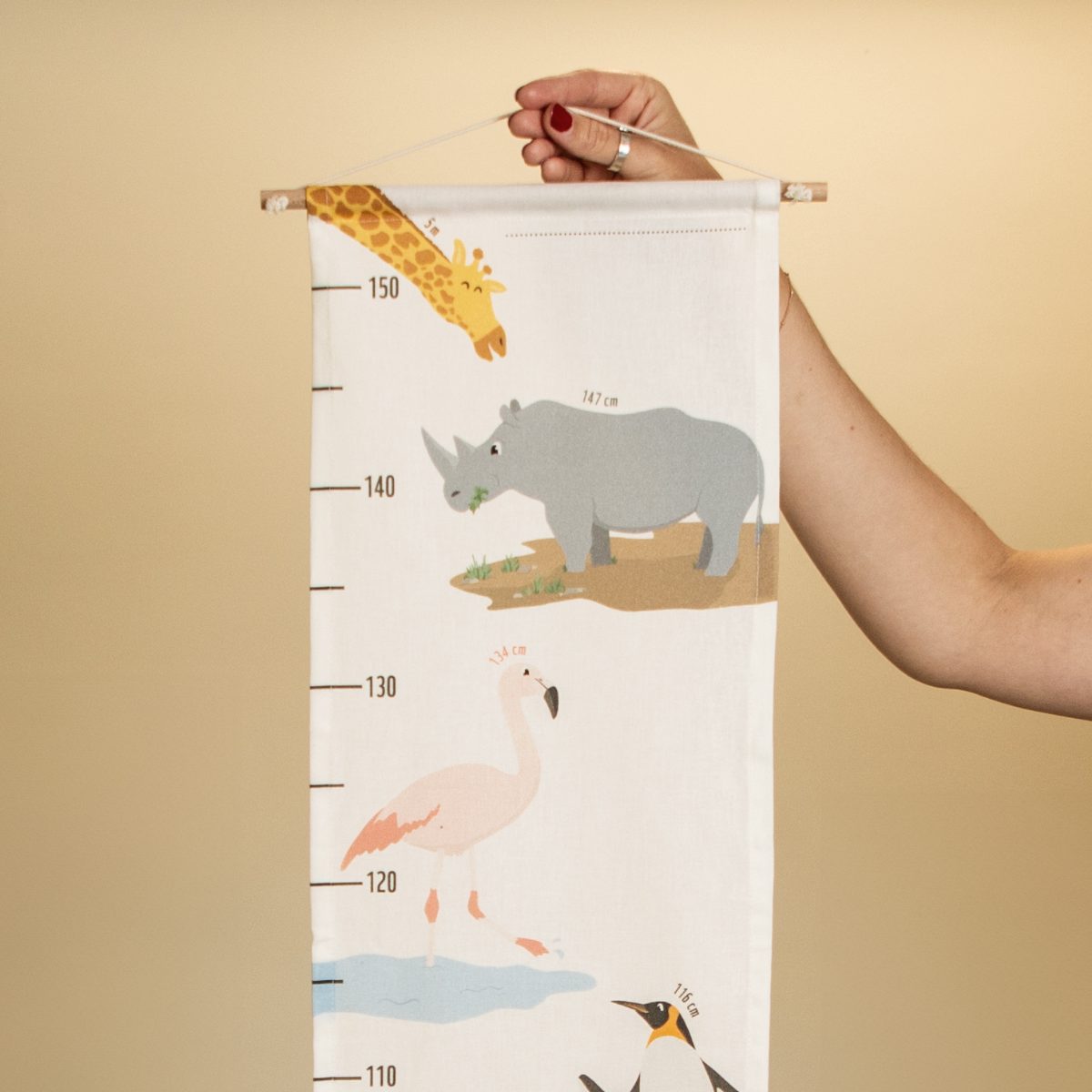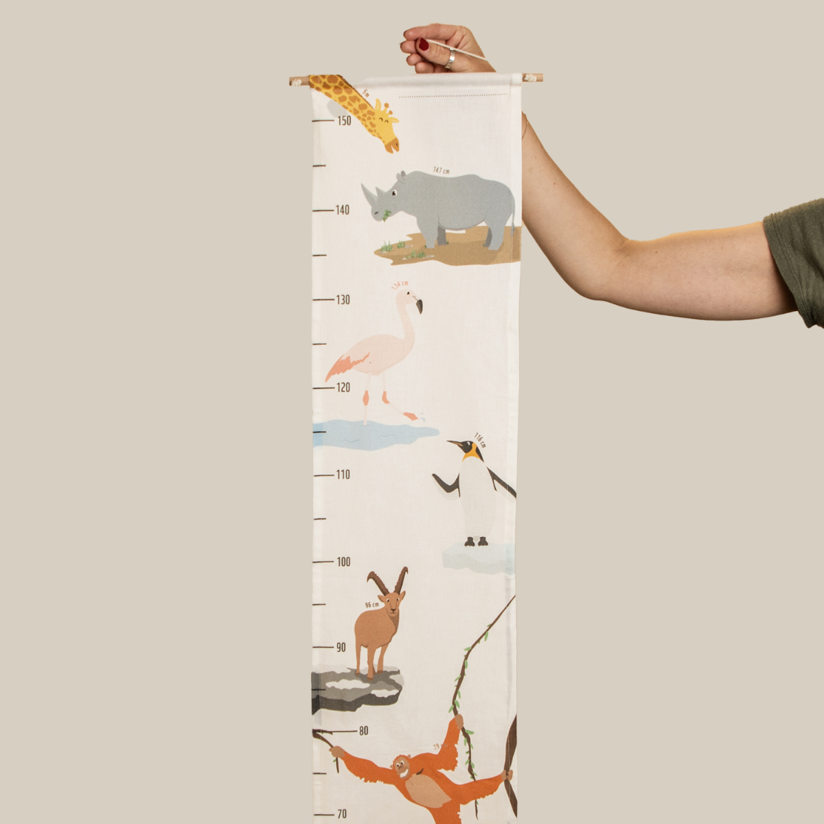 Auf der Messlatte kann aufgezeichnet werden, wie viel die kleinen Entdecker:innen gewachsen sind. Damit es keine Verwechslungen gibt, kann ein oder mehrere Namen am Rand der Messlatte aus Bio-Baumwolle festgehalten werden. Das Kindermassband reicht bis zur Grösse eines Nashorns (150 cm) und kann einfach an der Wand befestigt oder verstaut werden.