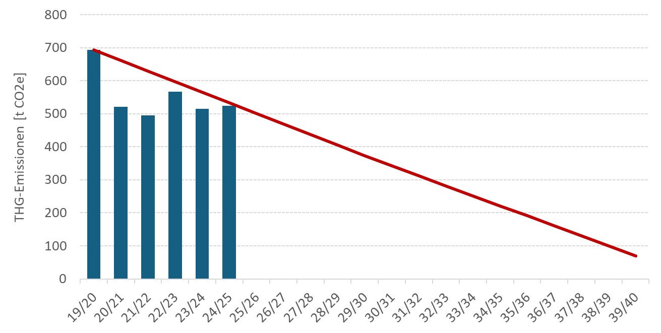 Abbildung: Die Entwicklung der Treibhausgasemissionen des WWF Schweiz, beginnend im Basisjahr der Klimazielsetzung 19/20 sowie Abbildung des Reduktionsfortschritts (Balken) gegenüber dem definierten Zielpfad (rote Linie).
