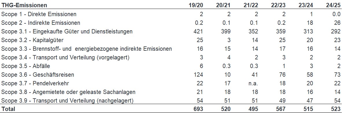 Tabelle: Die Treibhausgasemissionen des WWF Schweiz nach GHGP unterteilt nach Scopes (Scope 1-3) sowie nach Scope 3 Kategorien seit dem Basisjahr der Zielsetzung 2019/2020.
